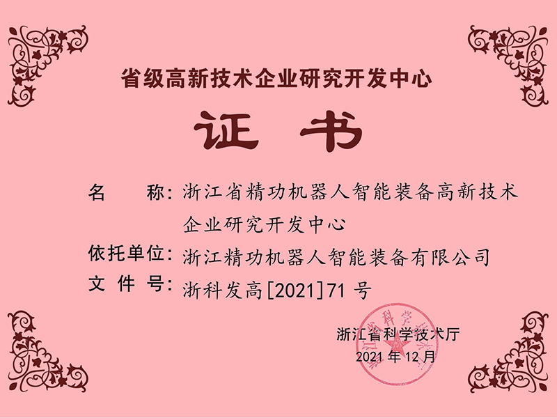 近日,精功机器人收了到由浙江省科学技术厅颁发的“省级高新技术企业研究开发中心”证书,这标志着精功机器人在研发和创新方面得到省级相关部门的肯定与认可。